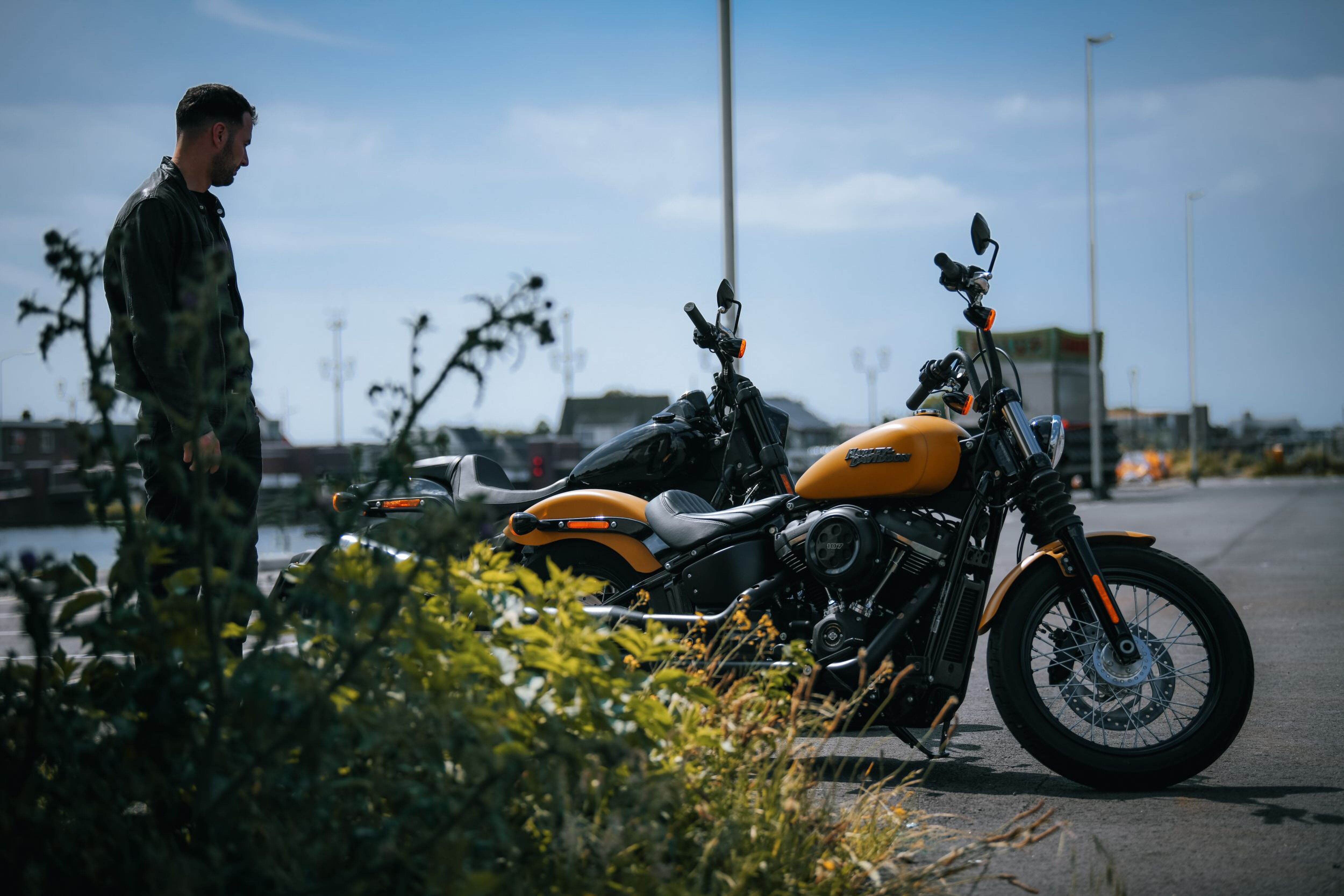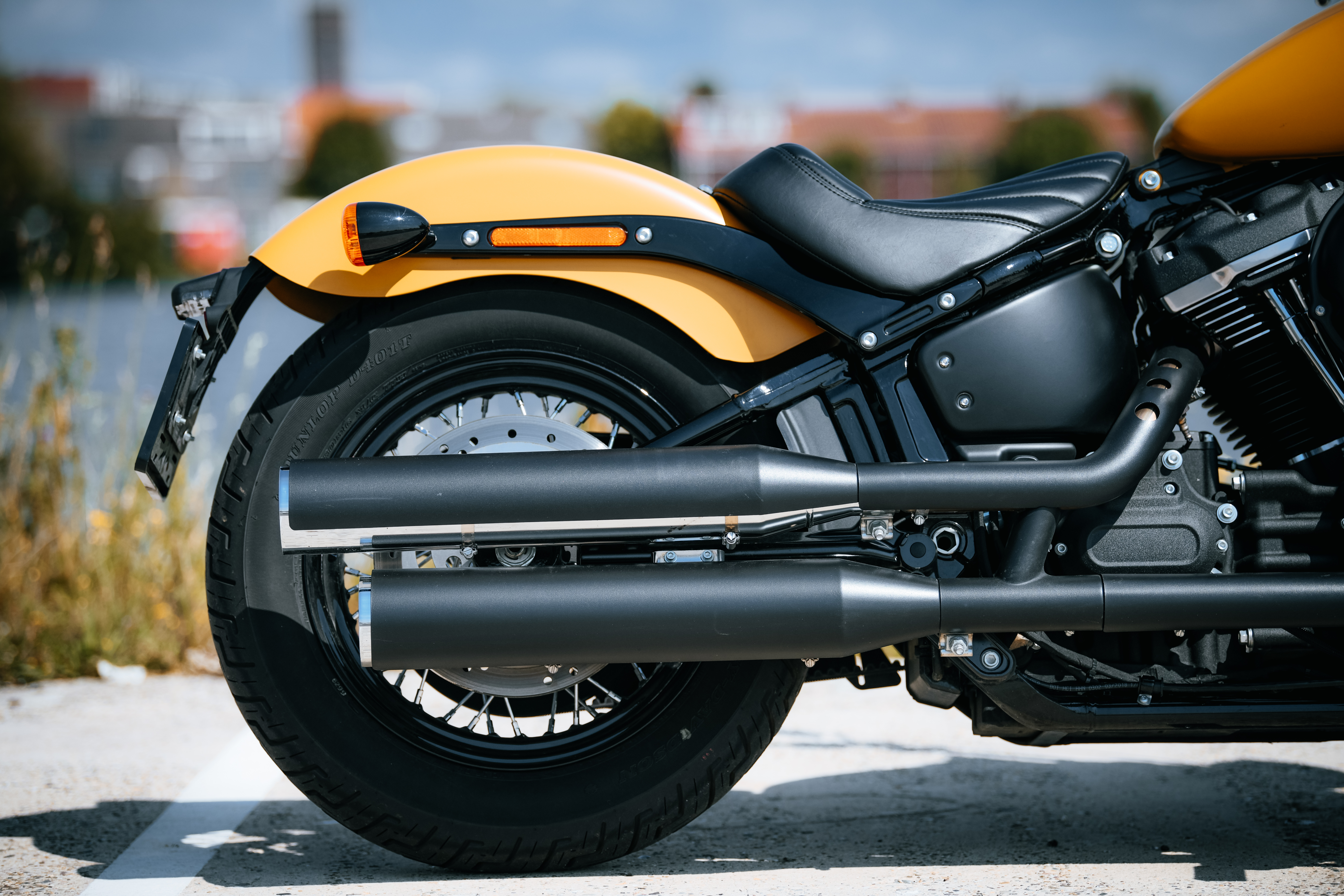 De nieuwe Harley-Davidson Street Bob die wij meekregen was helemaal blacked-out, op de tank en spatborden na. En die kleur, ja die was even wennen toen we hem voor de eerste keer zagen. De lakkleur heet Rugged Gold Denim, een soort van matgele/oranje kleur. Hoewel we zelf voor een iets minder opvallende kleur zouden gaan misstaat de kleur de Street Bob zeker niet.